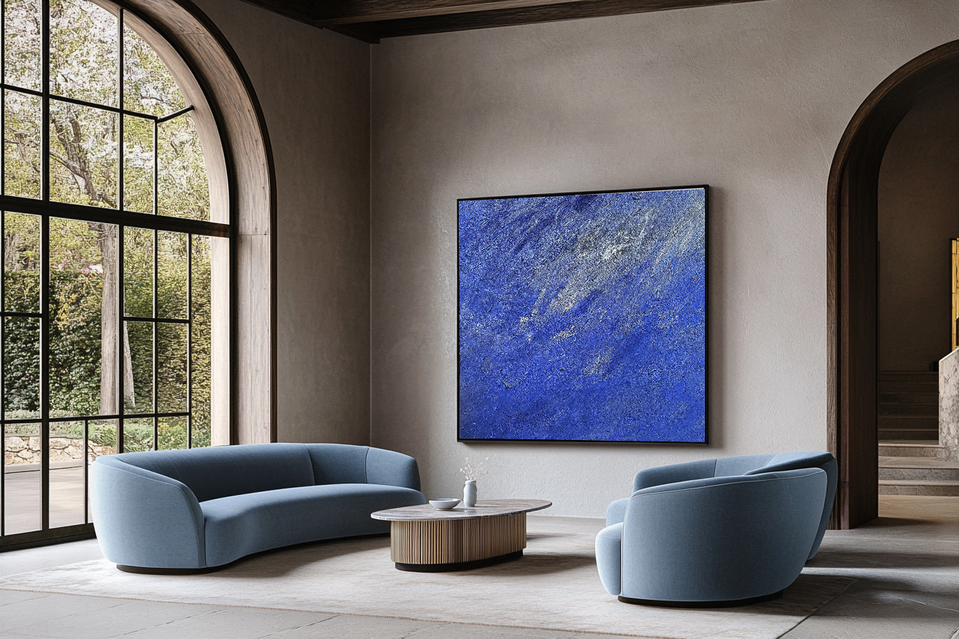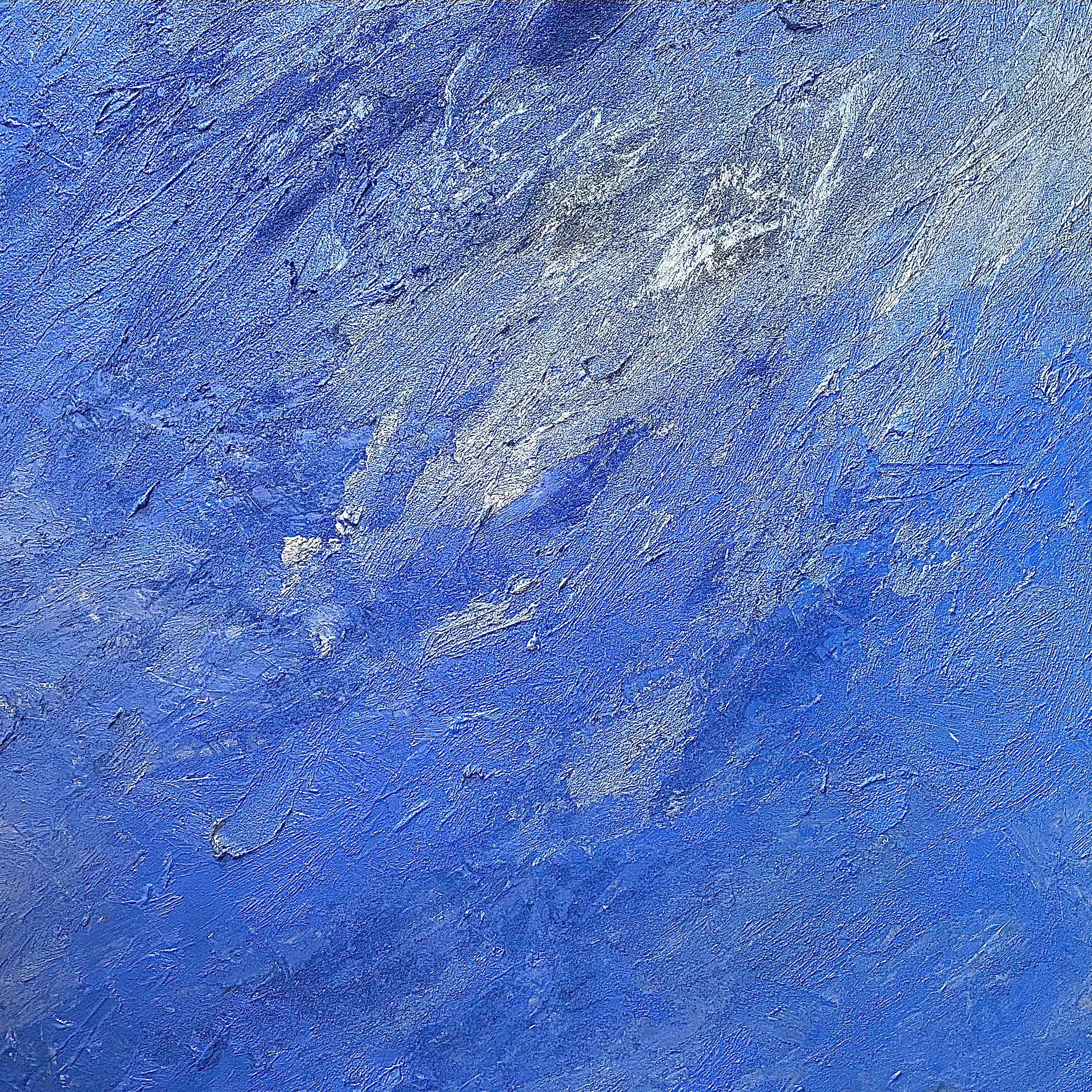 In Dive In, the viewer is immediately engulfed in a vast expanse of textured blue, an oceanic field that invites both contemplation and surrender. The canvas is dominated by varying shades of deep cobalt, cerulean, and indigo, with delicate touches of lighter blues and hints of silvery white breaking through the surface like flashes of light piercing the water. This painting feels immersive, as if it holds the viewer suspended in a boundless, aqueous world.