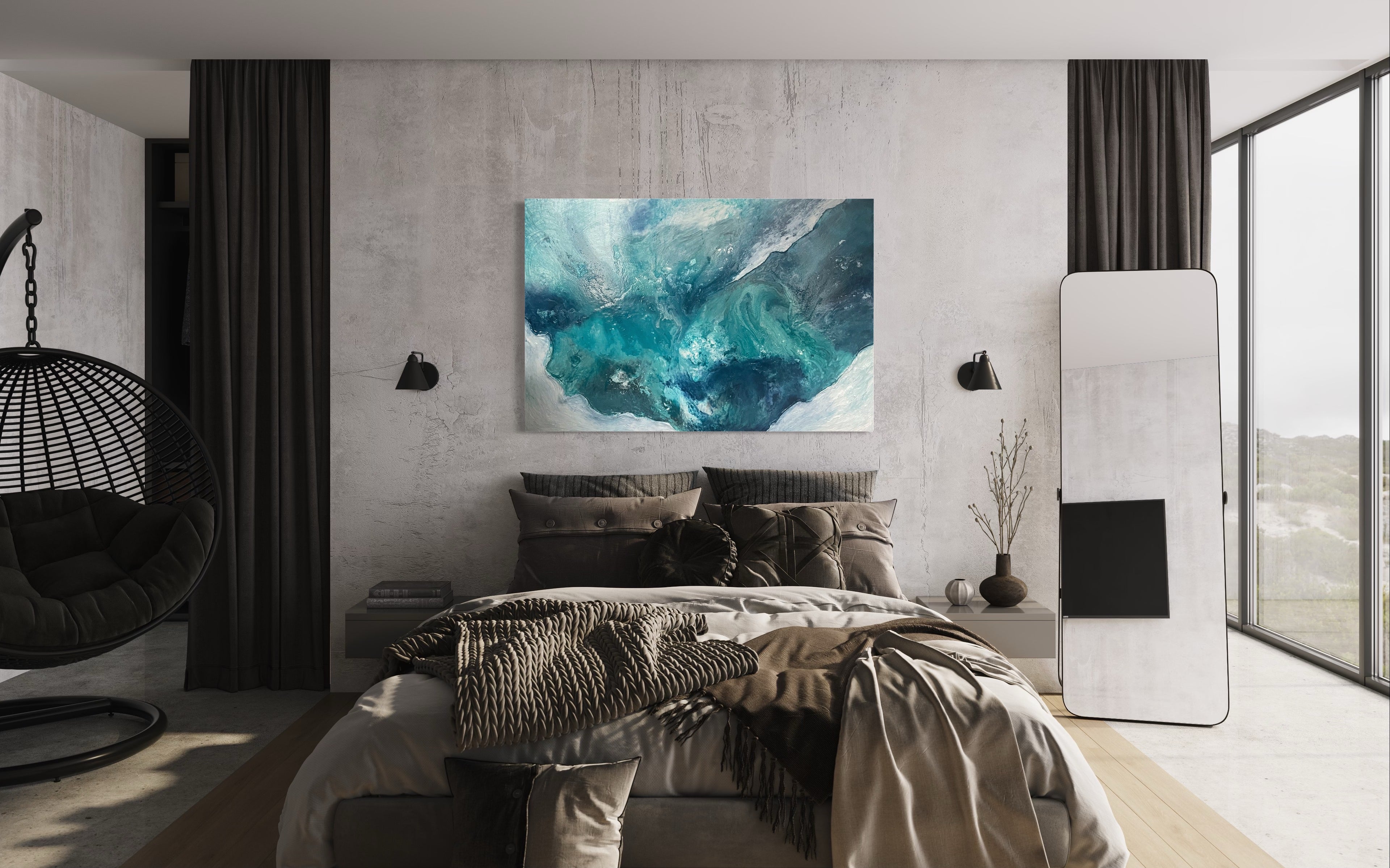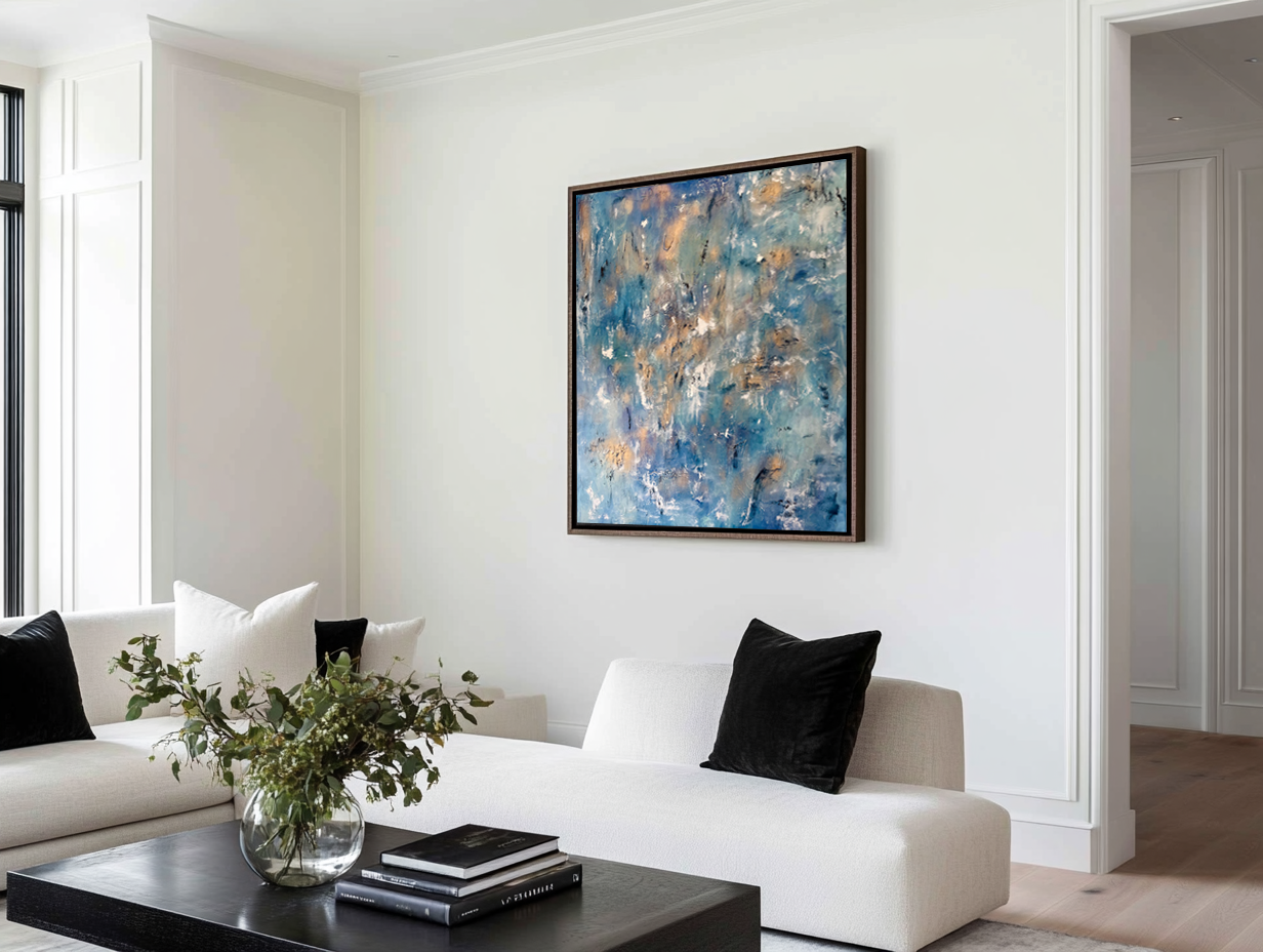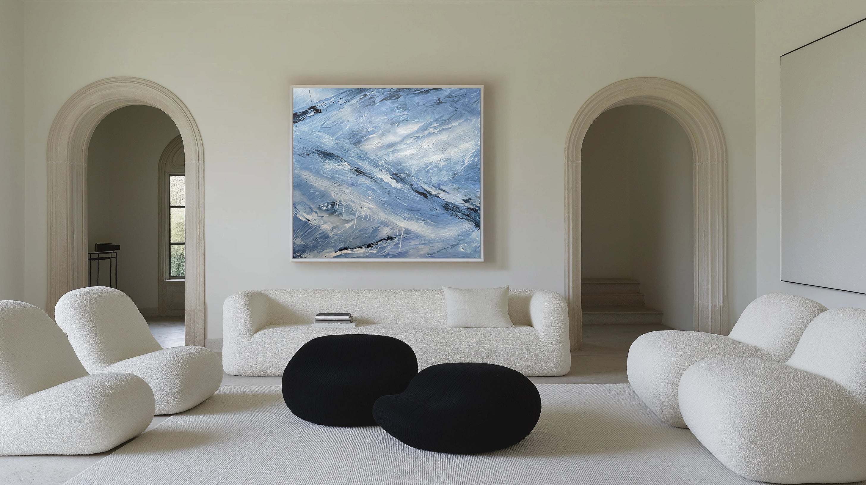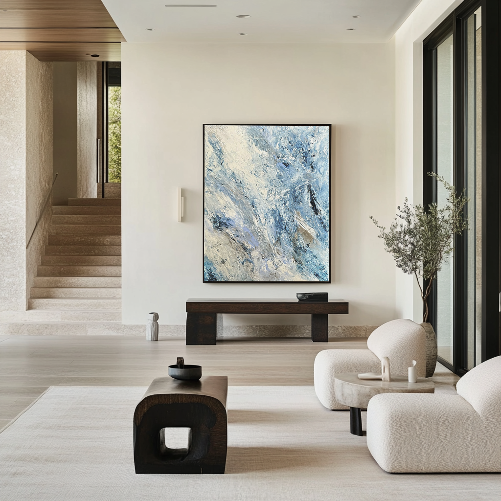 Commissioned for a client’s elegant living space, this artwork was crafted to evoke a sense of calm and depth. Designed to enhance the room’s refined palette, this custom piece brings tranquility and sophistication, blending seamlessly with the home’s modern, airy atmosphere.