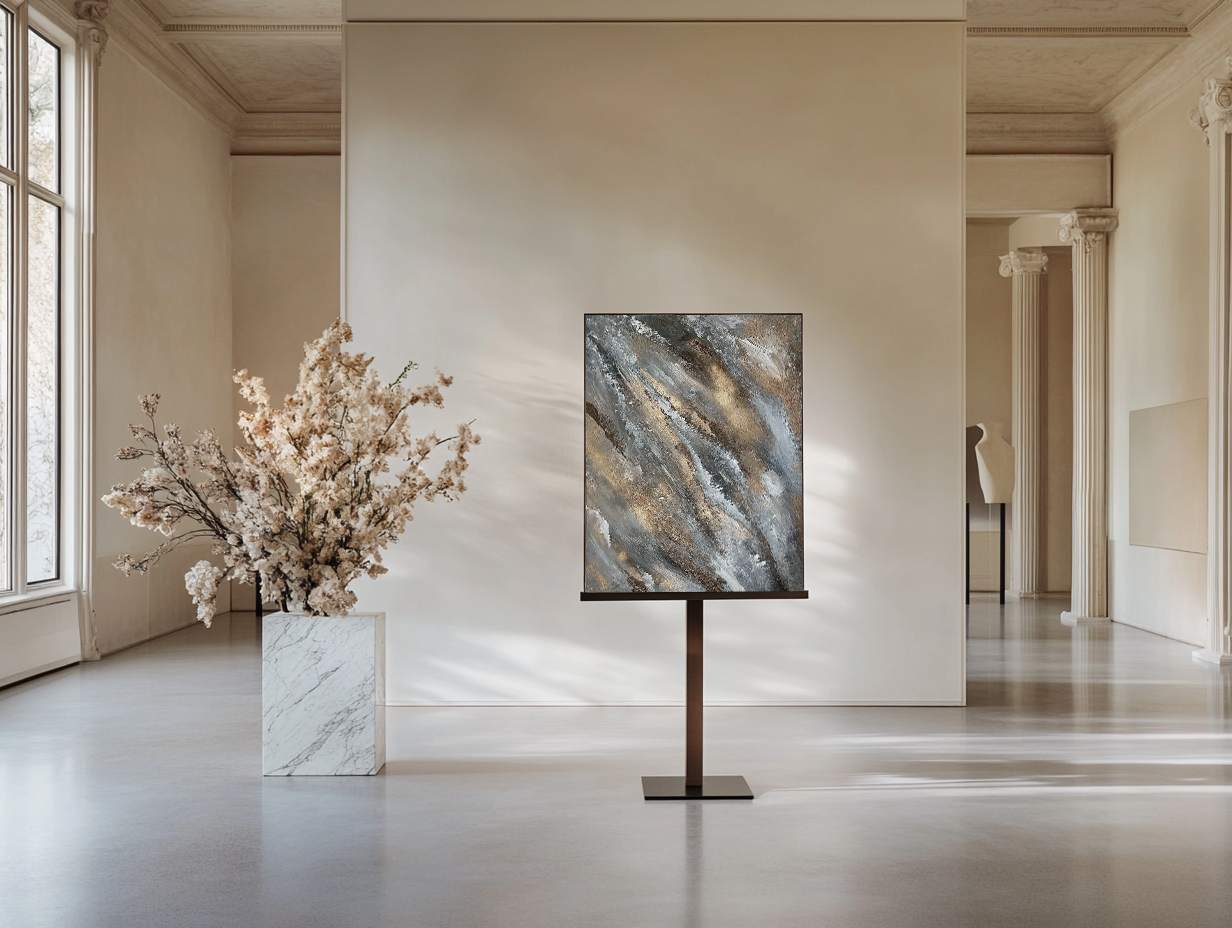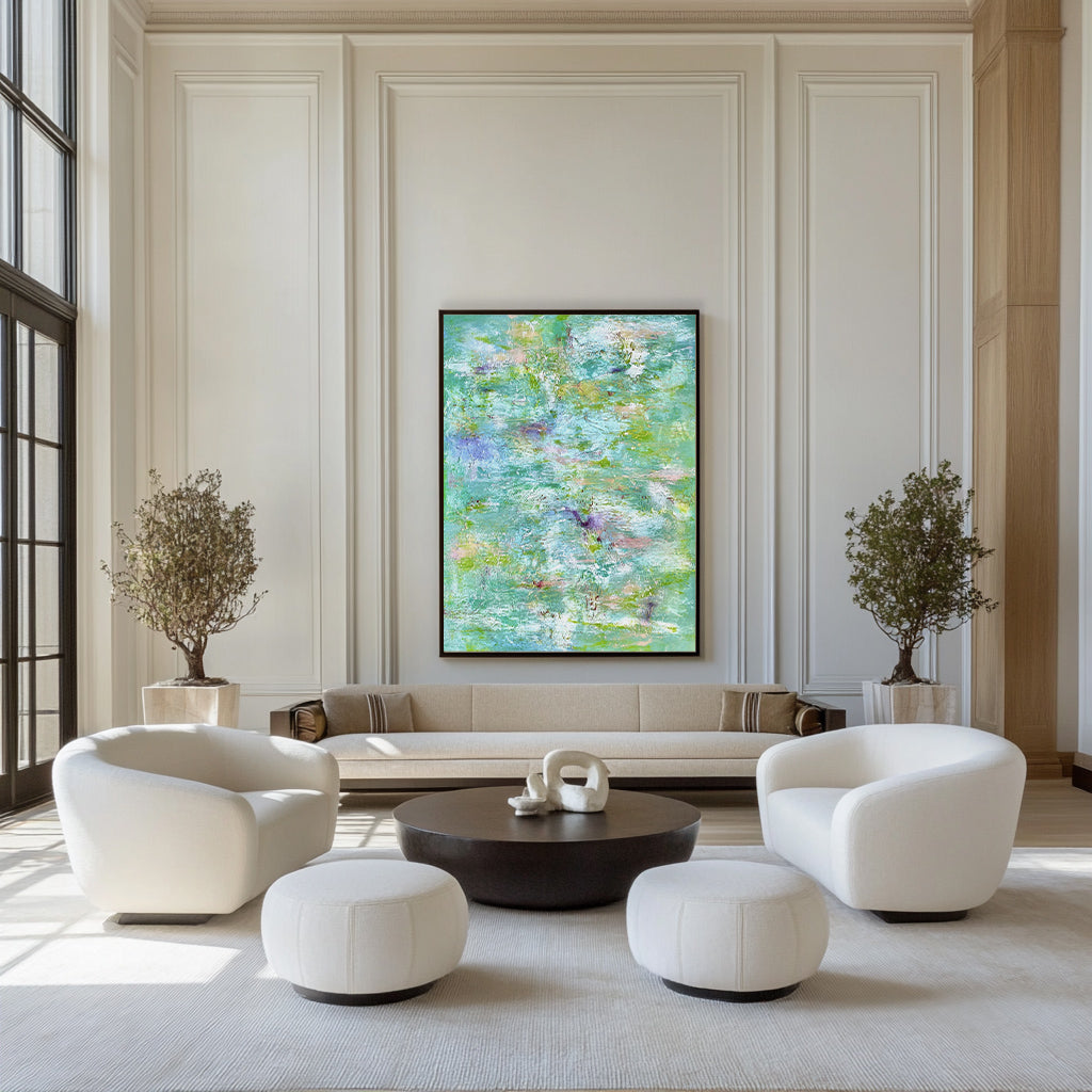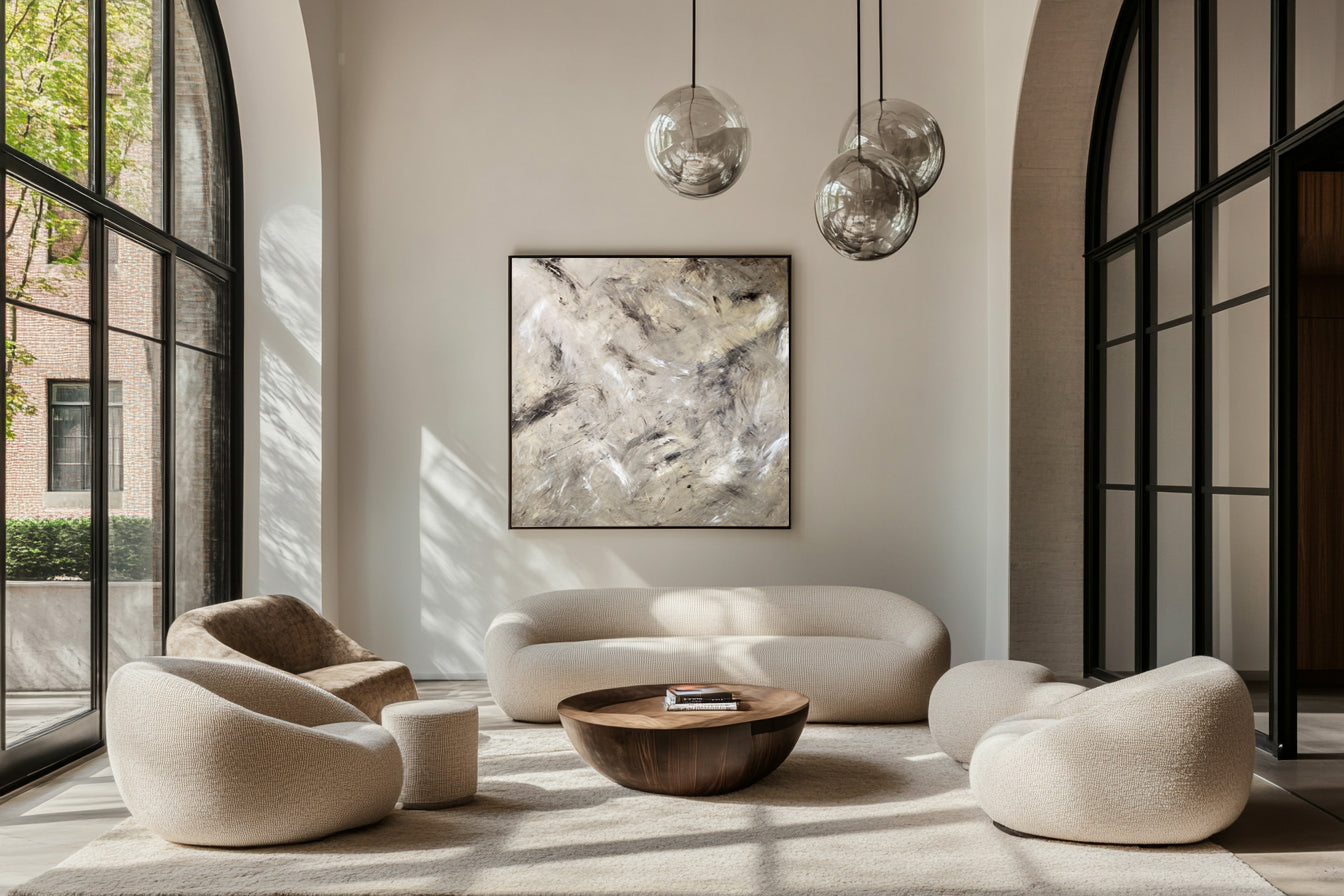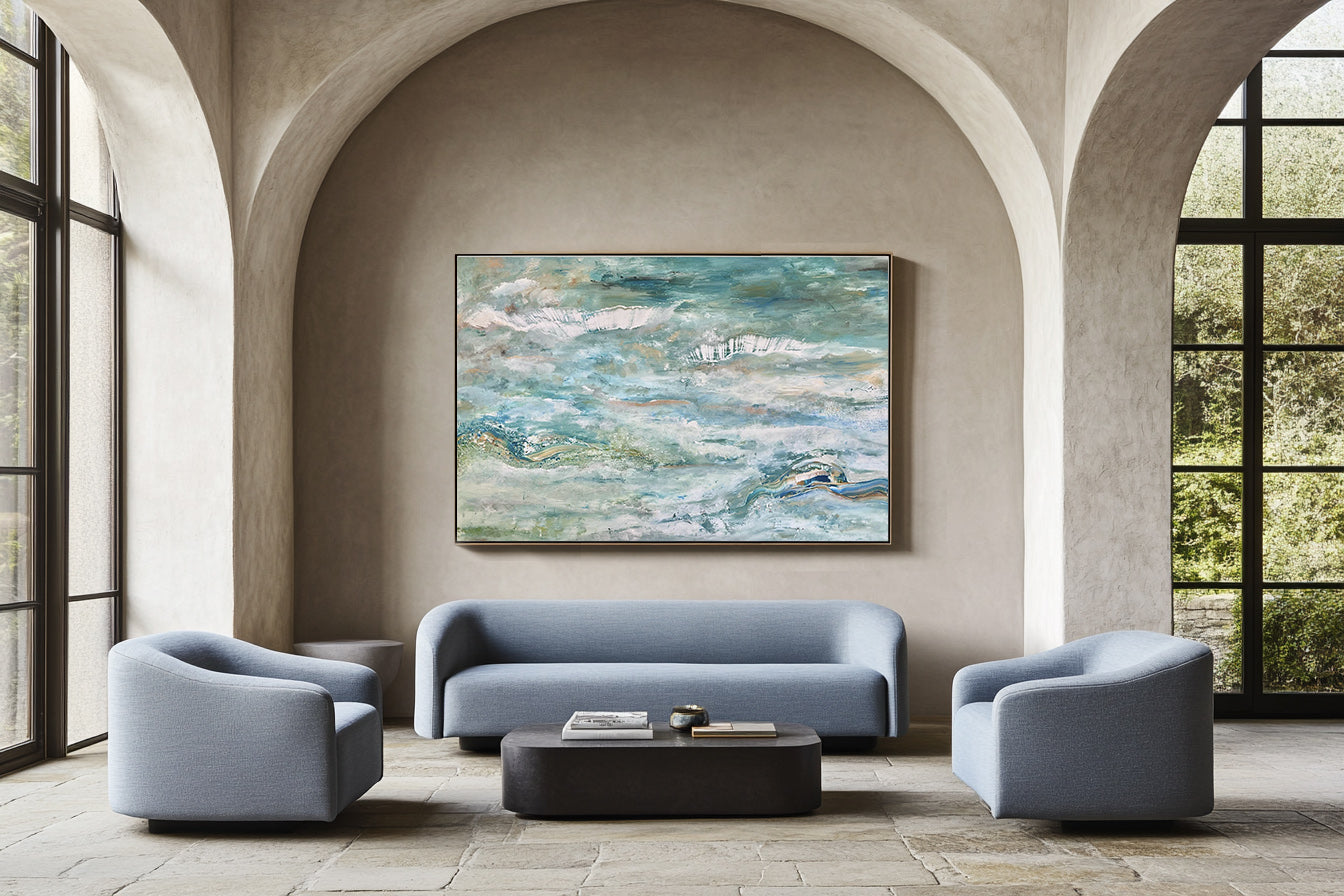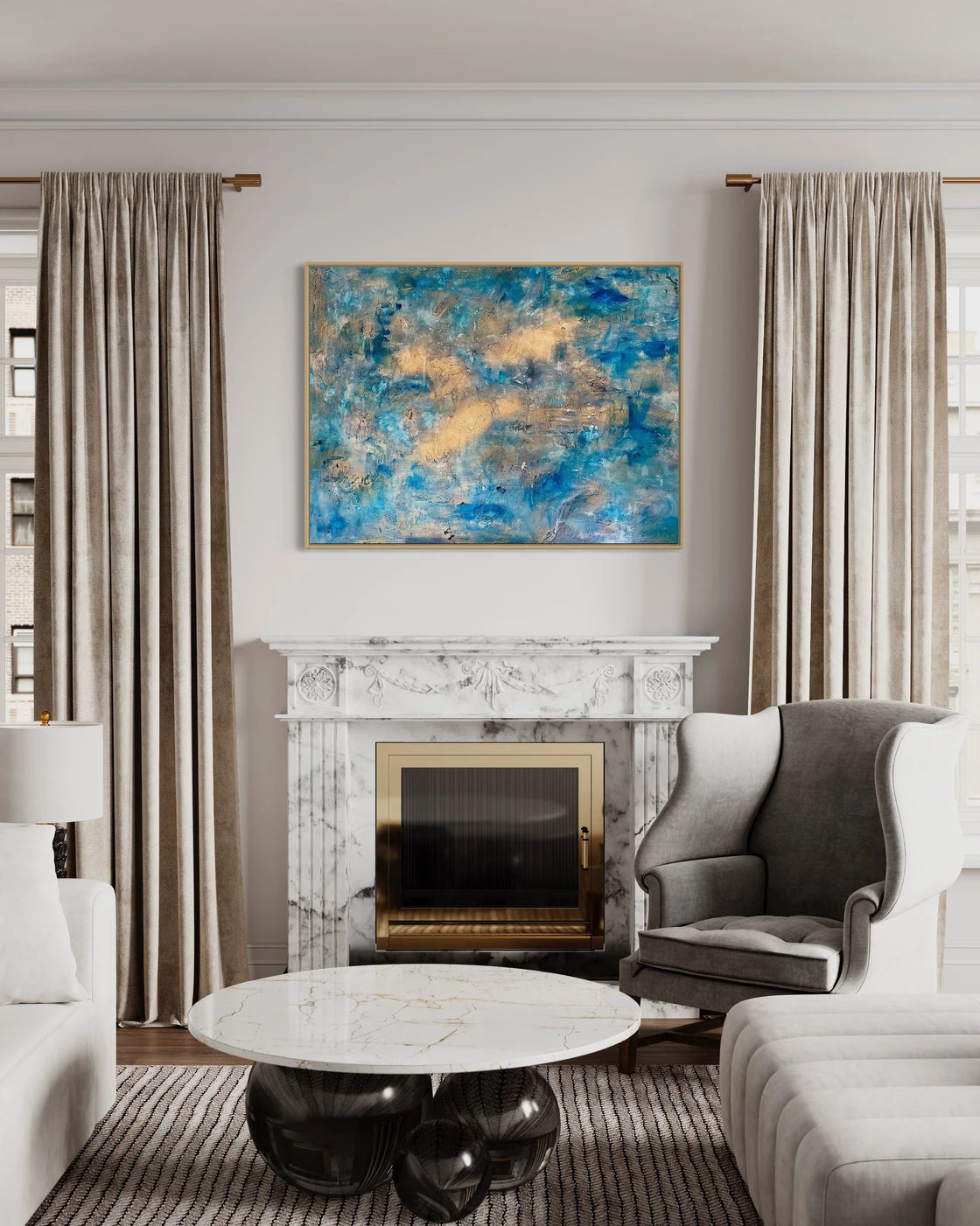 Commissioned for a client’s elegant living space, this artwork was crafted to evoke a sense of calm and depth. Designed to enhance the room’s refined palette, this custom piece brings tranquility and sophistication, blending seamlessly with the home’s modern, airy atmosphere.