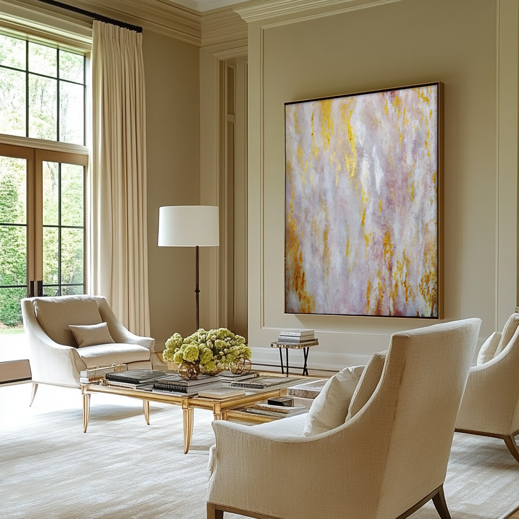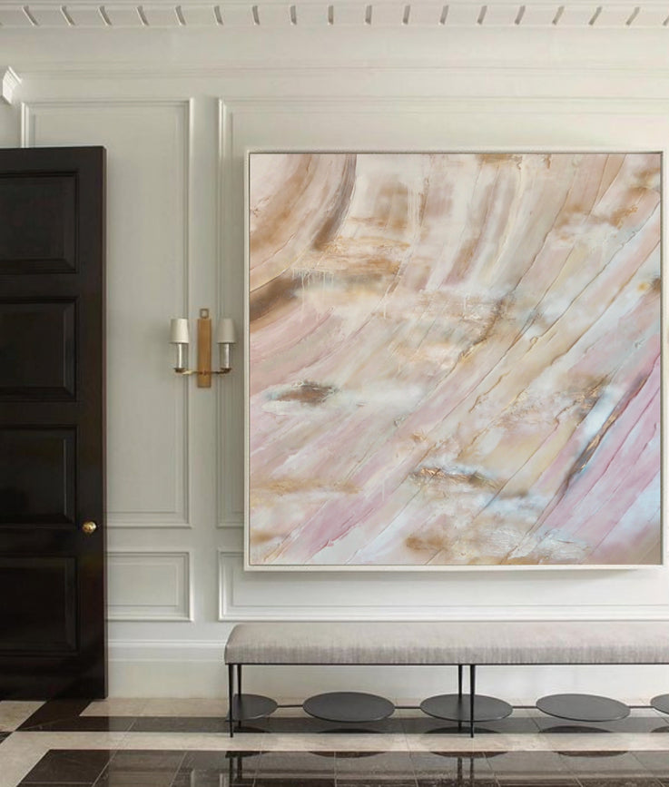 This stunning piece was commissioned by a wonderfull client who envisioned a blend of pink and gold with a tactile, textured surface. The resulting artwork radiates warmth and sophistication, with shimmering layers that catch the light and add depth to the painting.