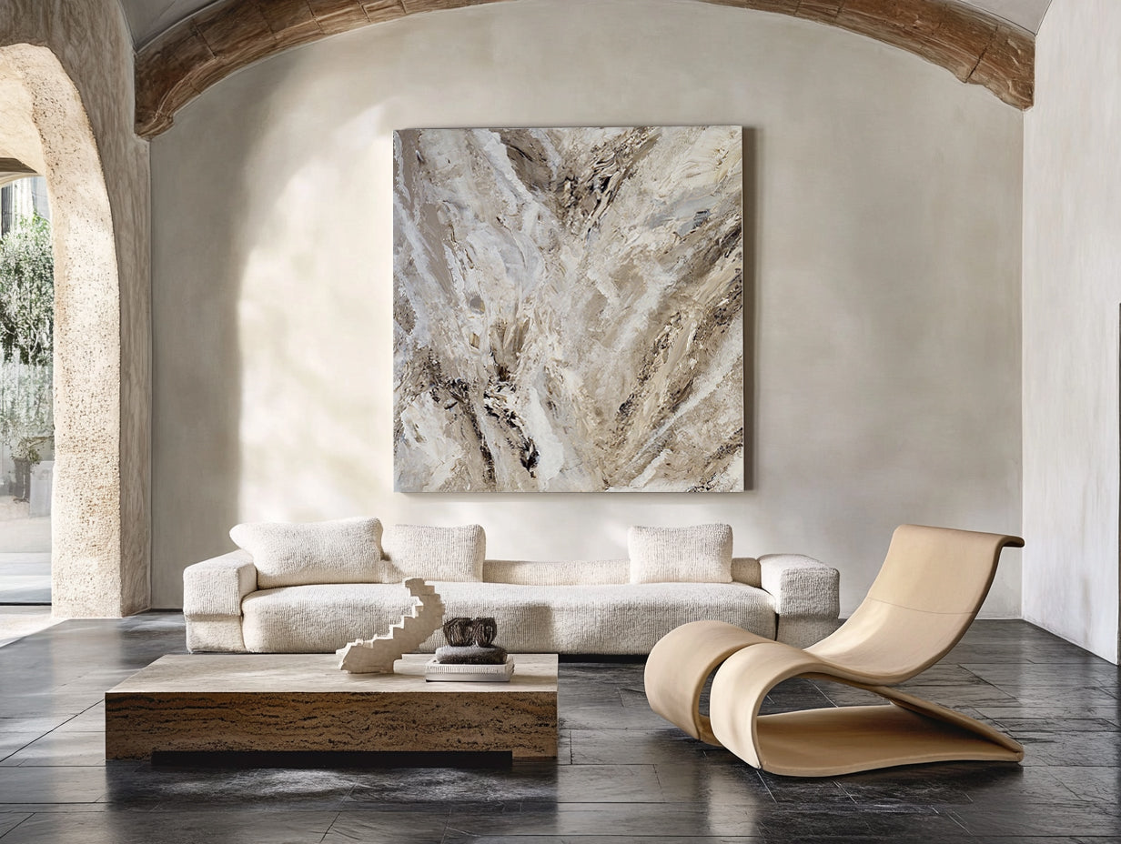 Commissioned by a couple seeking elegance and simplicity, this bespoke artwork was crafted in a neutral palette to harmonize with their refined space. Its soft, textured layers bring a dynamic yet serene presence, adding an exclusive touch that reflects their appreciation for understated sophistication.