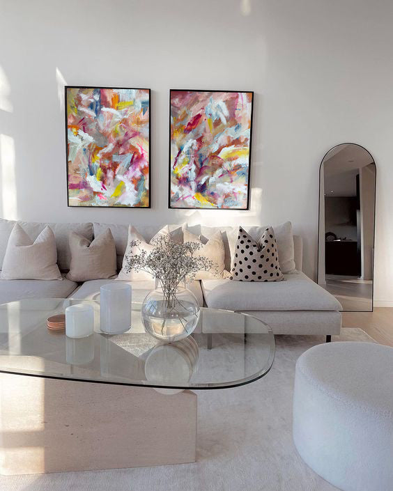 The artwork is a vibrant diptych artwork, overflowing with rich colors that bring a sense of joy and energy. Commissioned for a client’s new home in Copenhagen, these paintings add a lively, beautiful touch to their space, celebrating warmth and wonder.