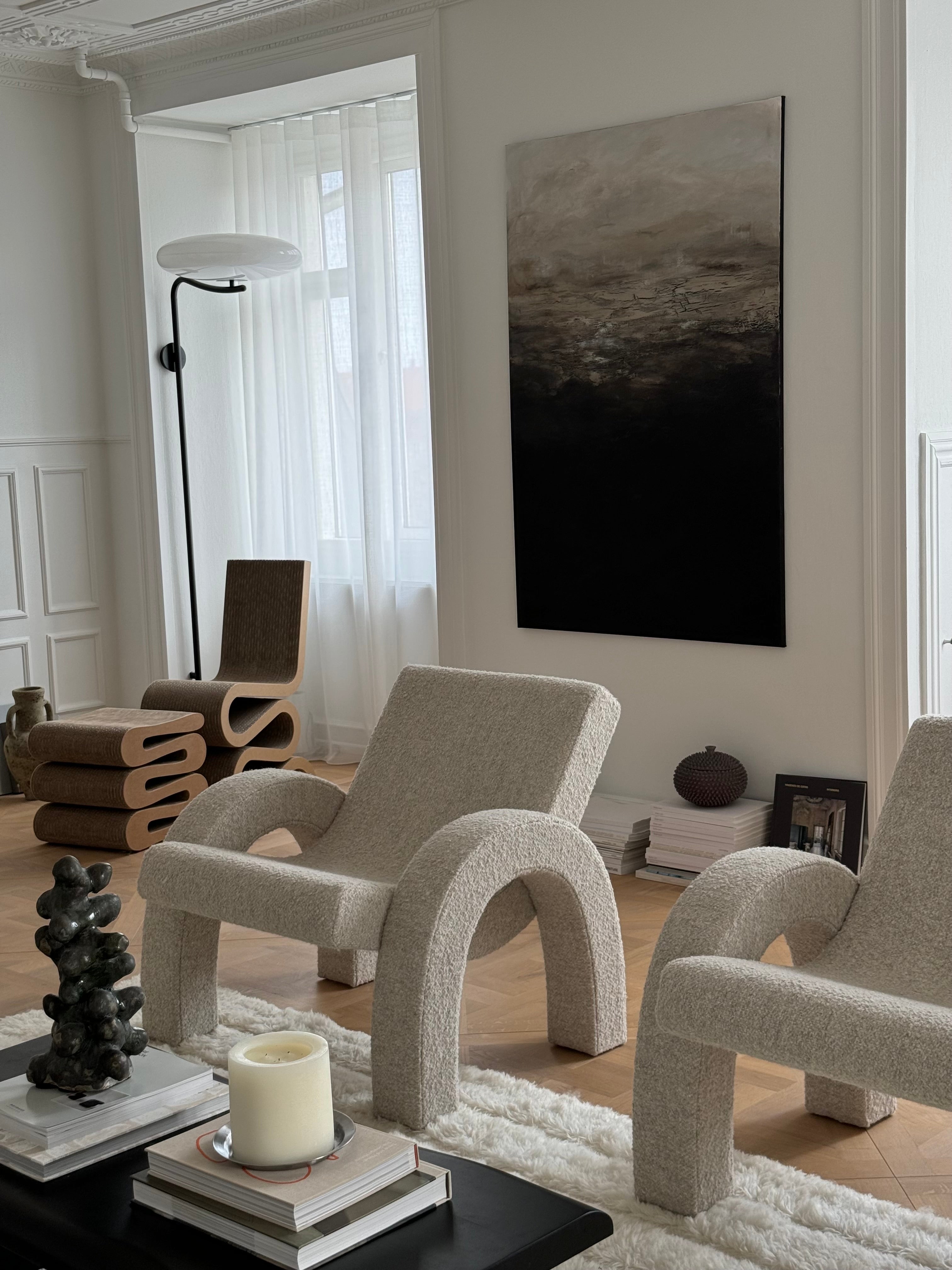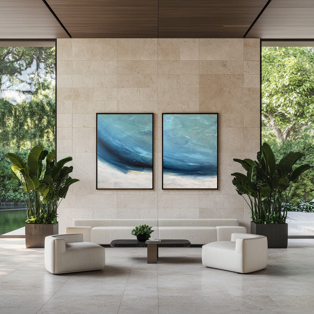 Commissioned for a Copenhagen couple, this artwork celebrates the home's proximity to the ocean with a palette of endless blue hues. A harmonious blend of softness, it radiates calmness and peace.